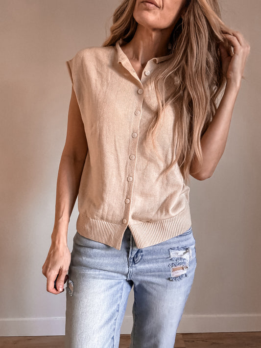 Buttoned Front Rolled Hem Cap Sleeve Sweater Top