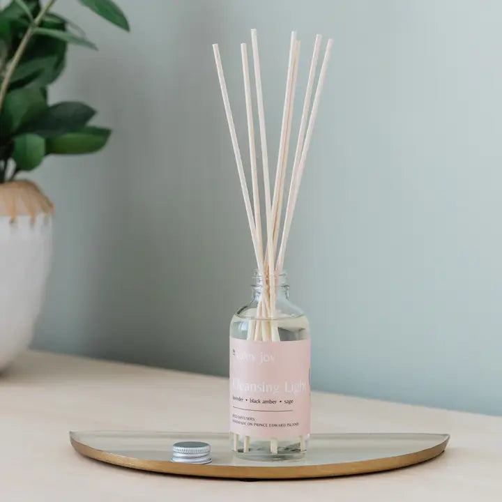 Cleansing Light; lavender, black amber, and sage create the heart of this rich and comforting scent. A scent perfect for yoga, self-care, spas, or creating the perfect relaxing atmosphere at home! Sweet floral and warm earthy tones, Cleansing Light is steady as she goes. Notes: Lavender • Black Amber • Sage Made with: Sustainable natural wooden reeds Phthalate free refined fragrance oil Recyclable glass bottles For those who wish for a continued scent naturally dispersed throughout a room without the use of a flame. Long-lasting, and a household favourite, diffusers last 6+ months. Care Instructions: Flip stems weekly to ensure scent stays fresh and fragrant in the home. Handmade By Caley Joy in Summerside, PE