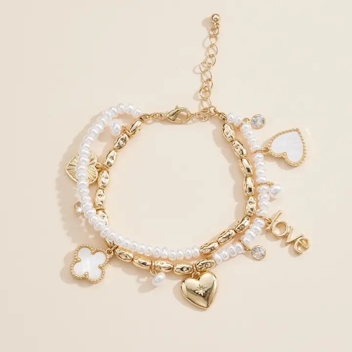 Add elegance and charm to your jewelry collection with this stunning layered pearl bracelet, available in gold-tone and silver-tone finishes. Designed with a mix of faux pearls, textured beads, and delicate charms, including a heart, clover, love pendant, and cubic zirconia charms, this bracelet is perfect for any occasion. Its adjustable chain ensures a comfortable fit for all.