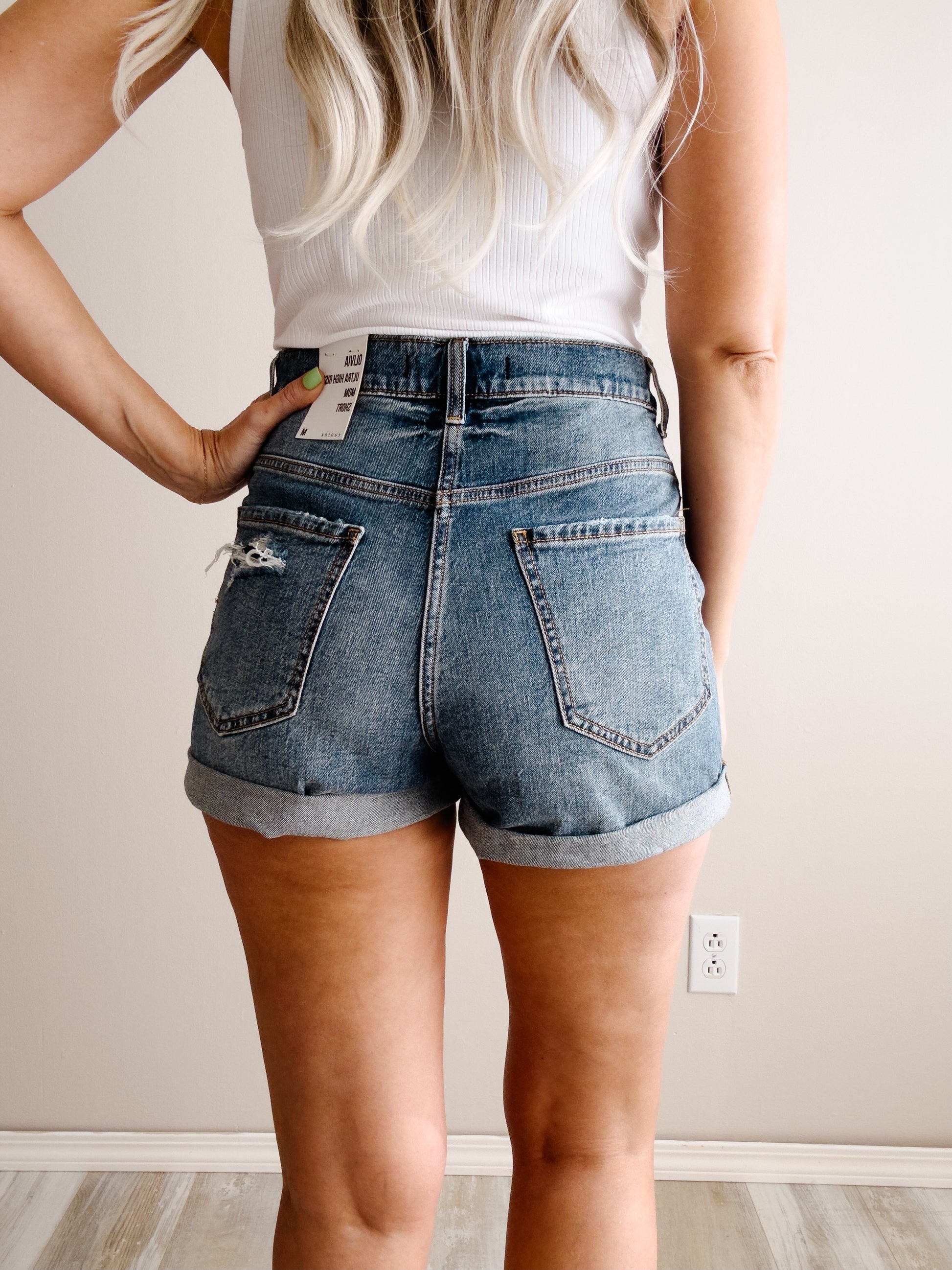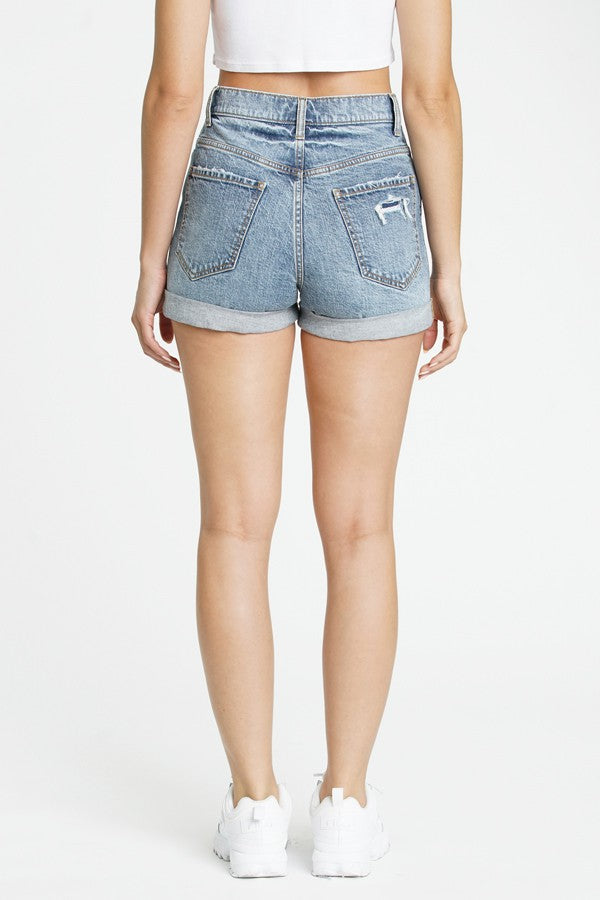 Medium wash denim shorts with cuffed/rolled hem This fit is manufactured in a sustainable fabric with an