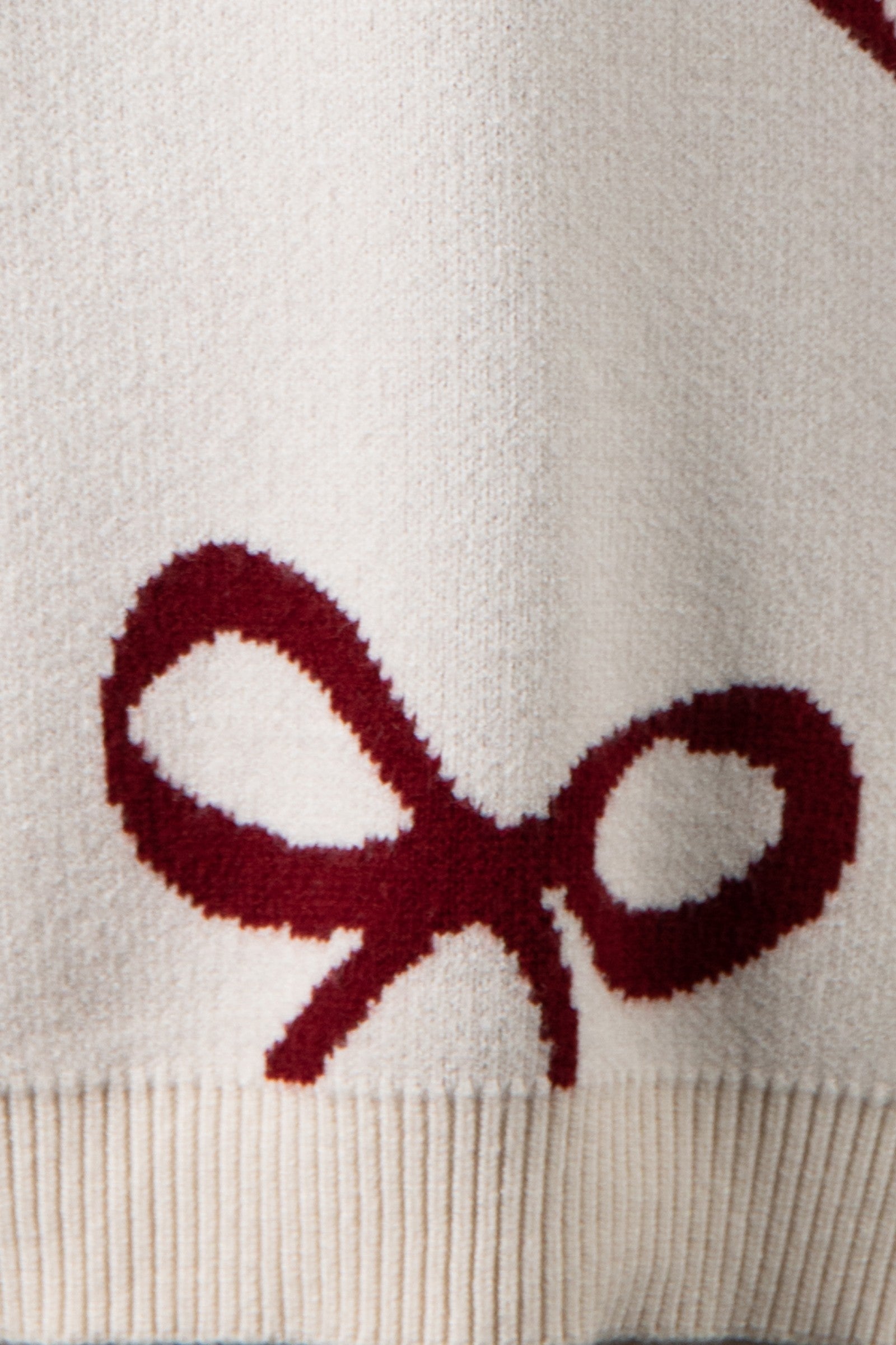 Cozy up in this charming sweater that's all about the details! Featuring an adorable scatter of red wine-colored bows across a soft beige knit, it's the perfect blend of sweet and sophisticated. The 55% cotton and 45% acrylic blend keeps you comfortable and warm without the bulk. Whether you're dressing up for a special occasion or keeping it casual, this playful piece brings instant personality to any outfit.