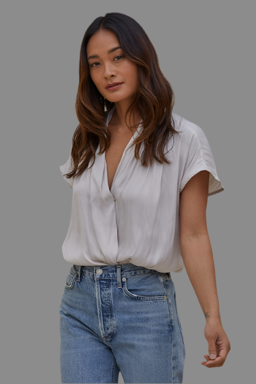 Wrap yourself in luxury with our Shine Bodysuit. Made with woven polyester satin, this short sleeve bodysuit features a surplice v-neck, creating a flattering silhouette. Soft and comfortable, it's perfect for any occasion. You won't want to take it off!