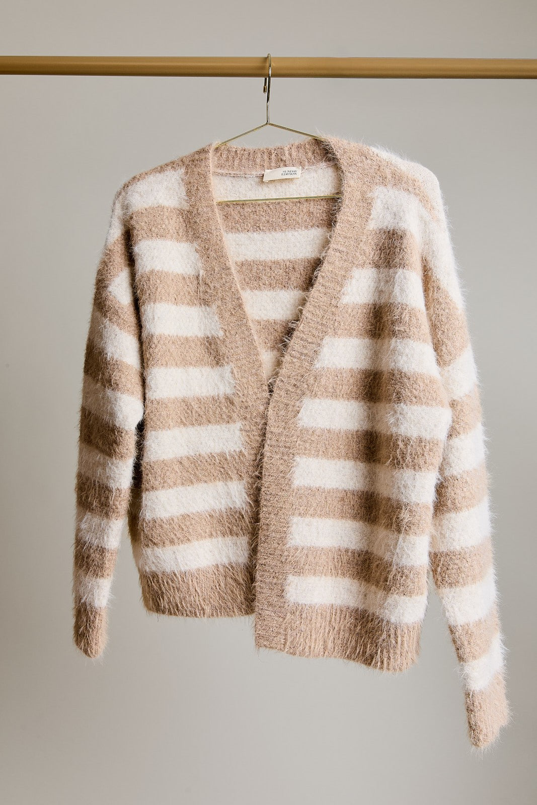Wrap yourself in comfort with the Stripe Sweater Cardigan—a fuzzy, cozy hug you can wear all day. Its soft texture and playful stripes add a fun twist to your casual look while keeping you warm and snug. Perfect for lazy days or layering up for chilly adventures!