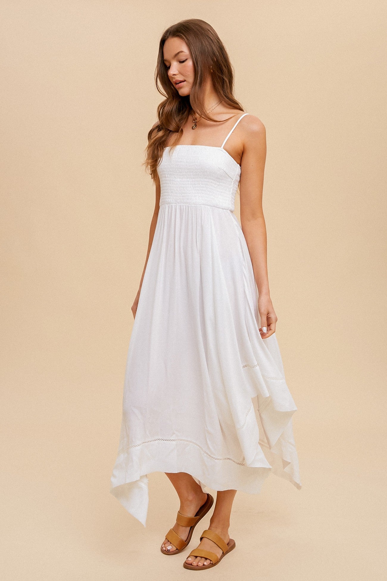 Elevate your style with our White Asymmetrical Cami Dress! This midi dress features smocking and an asymmetrical hem for a unique touch. Made with a blend of 70% polyester and 30% cotton, it's perfect for any occasion - from casual weekends to special events. Just pair with some accessories and you'll be the talk of the town!